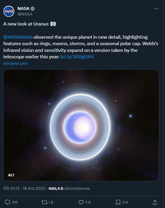 NASA, Webb’in kızılötesi görüşü ve hassasiyetiyle buz devi sınıfına giren gezegenin halkaları, eğimi, kutup başları ve uydularına ilişkin yeni ayrıntılarla gözlemlediğini duyurdu.