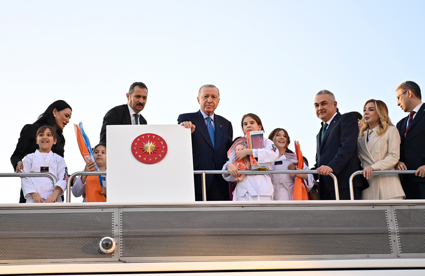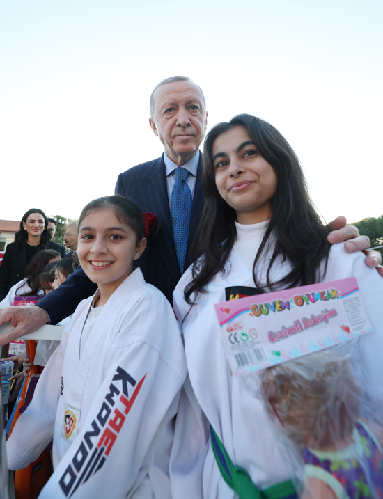 Alandaki sporcu çocuklara seslenen Cumhurbaşkanı Erdoğan, “Sizden özellikle sportif faaliyetlerinizde hep bir numara olmanızı bekliyoruz. Karatede, tekvandoda sizlerden geleceğe yönelik inşallah olimpiyat şampiyonları çıkmasını bekliyoruz” diye konuştu.