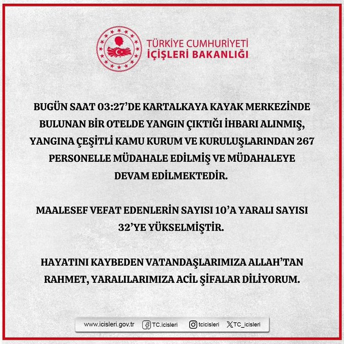 İlk belirlemelere göre yangında 10 kişi hayatını kaybederken 32 kişi de yaralandı. Yangınla ilgili 4 başmüfettiş görevlendirildi.