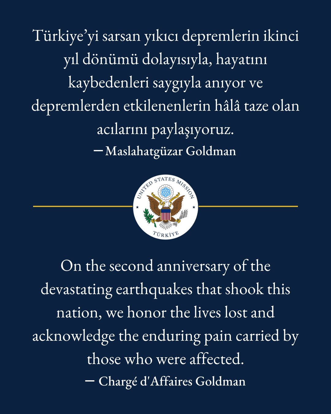 ABD’nin Ankara Büyükelçiliği, 6 Şubat 2023’te meydana gelen depremlerin yıl dönümünde can kayıpları anarak bir mesaj yayımladı.