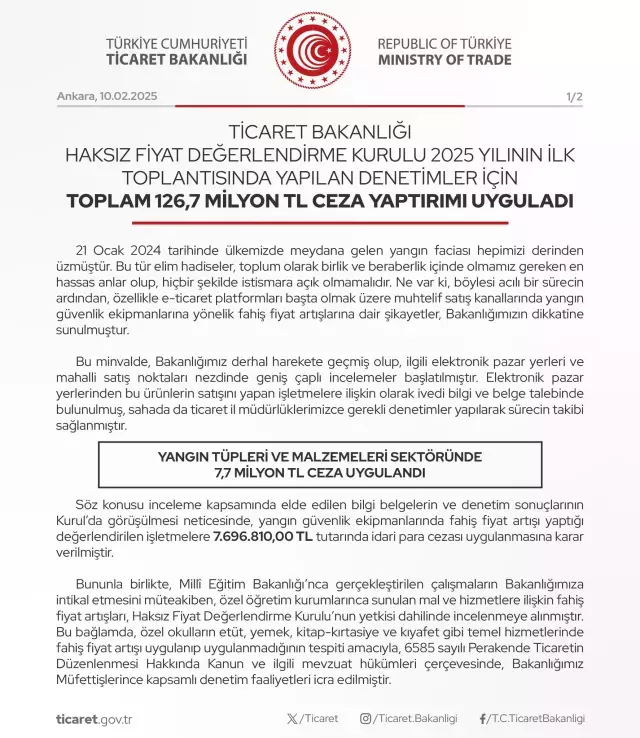 Bolu Kartalkaya’da 78 vatandaşımızı kaybettiğimiz yangın faciasının ardından harekete geçen Ticaret Bakanlığı yetkilileri, yangın güvenlik ekipmanlarında fahiş fiyat artışı yaptığı değerlendirilen işletmelere 7.7 milyon TL ceza kesti.