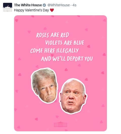 Beyaz Saray, sosyal medya hesabından, ABD Başkanı Donald Trump’ın göçmen politikalarını hatırlatacak bir ‘Sevgililer Günü Şiiri’ paylaşıldı.