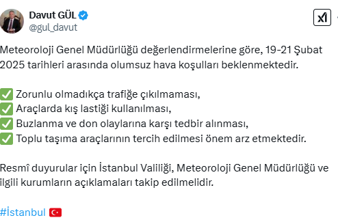 Vali Gül açıklamasında şu ifadelere yer verdi: “Meteoroloji Genel Müdürlüğü değerlendirmelerine göre, 19-21 Şubat 2025 tarihleri arasında olumsuz hava koşulları beklenmektedir. Zorunlu olmadıkça trafiğe çıkılmaması, araçlarda kış lastiği kullanılması, buzlanma ve don olaylarına karşı tedbir alınması, toplu taşıma araçlarının tercih edilmesi önem arz etmektedir. Resmî duyurular için İstanbul Valiliği, Meteoroloji Genel Müdürlüğü ve ilgili kurumların açıklamaları takip edilmelidir.”