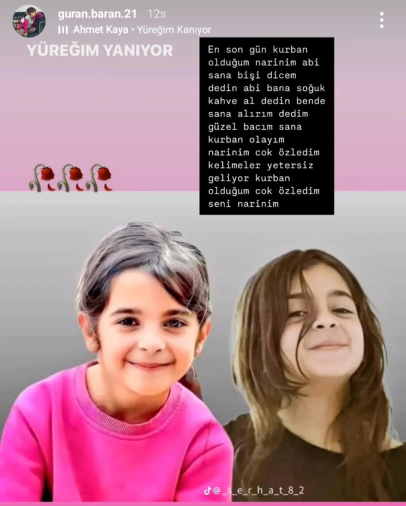 Baran Instagram paylaşımında kardeşi Narin’in kendisinden son isteğini açıkladı. Baran, “En son gün kurban olduğum Narin’im “Abi sana bir şey yiyaceğim” dedin. “Abi bana soğuk kahve al” dedin. Ben de “sana alırım” dedim.” ifadelerini kullandı.