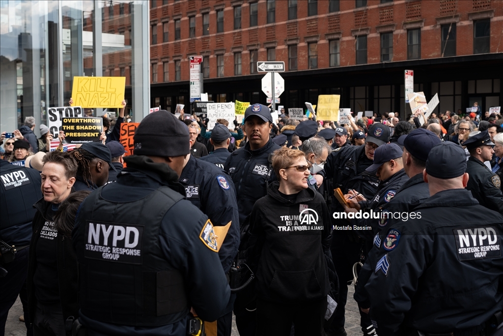 Manhattan bölgesindeki Tesla’nın otomobil bayisi önünde toplanan bir grup gösterici, Musk’ı ve ABD Başkanı Donald Trump hükümetinin politikalarını protesto etti.
