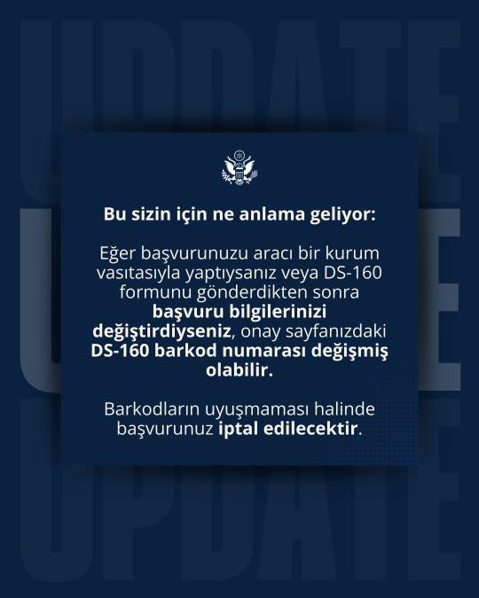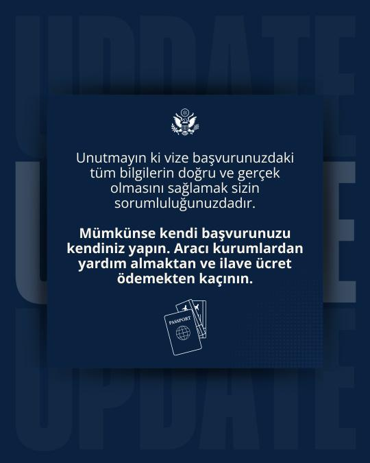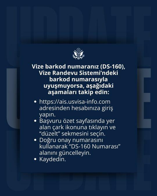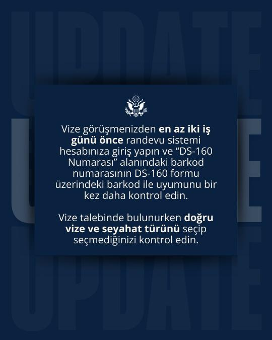 18 Mayıs 2025 tarihinden sonra Vize Randevu Sisteminin başvuru numaralarını düzeltme konusunda size yardımcı olamayacağını ve başvuru numaraları uyuşmayan başvuru sahiplerinin yeniden başvuruda bulunmak durumunda kalacağını bildirmek isteriz.