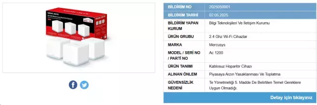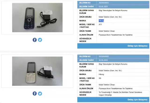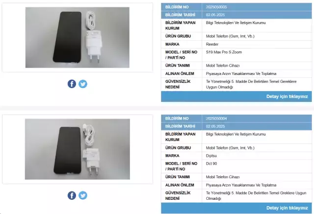Ticaret Bakanlığı, GÜBİS üzerinden Reeder, Dijitsu ve Hikıng markasına ait 4 telefon modelinin ve Mercusys marka bir kablosuz hoparlörün güvenlik standartlarını karşılamadığı gerekçesiyle toplatılmasına karar verdi. Söz konusu ürünlerden birine sahip olan vatandaşlar, satın aldıkları yere başvurarak ürünün iadesini yapabilecek veya başka bir ürünle değiştirme hakkını kullanabilecek.
