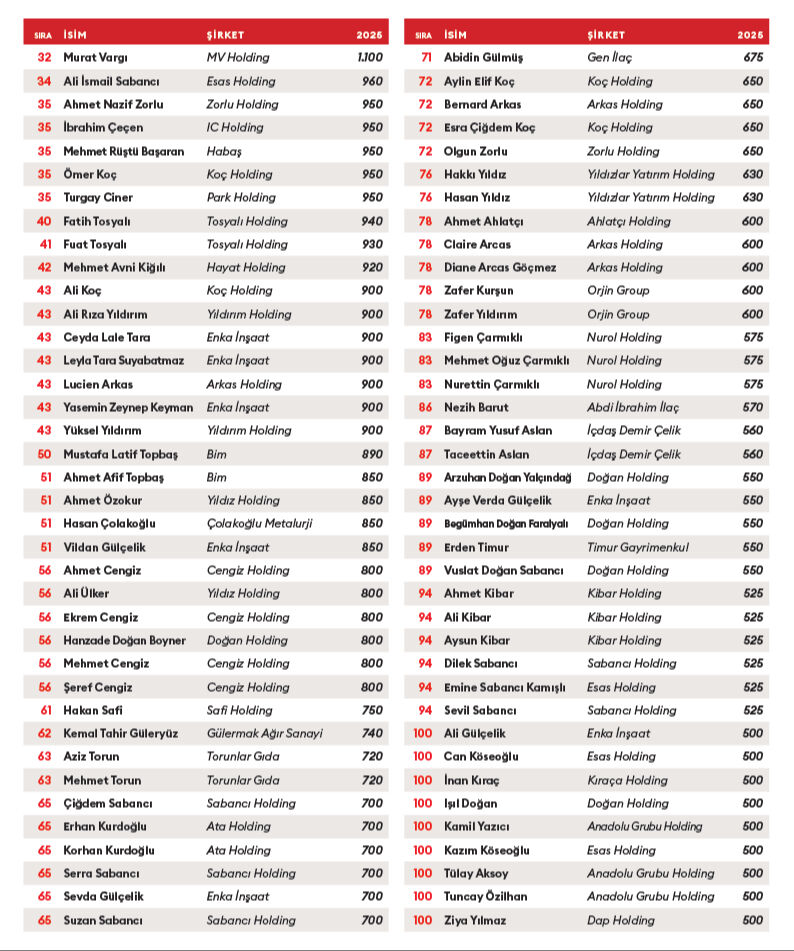 Listeye bu yıl ilk kez giren dört isim, Türkiye’nin girişimcilik dinamizmini ortaya koydu. Safi Holding Yönetim Kurulu Başkanı Hakan Safi, gayrimenkul ve enerji yatırımlarıyla listeye giriş yaptı. Gülermak’ın büyük hissedarı Kemal Tahir Güleryüz, şirketin 2025’teki halka arzıyla dikkat çekti.