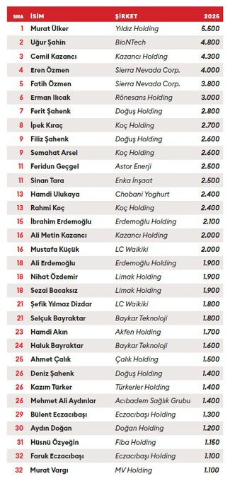 Listenin ilk üçü, Türkiye’nin gıda, sağlık teknolojisi ve enerji sektörlerindeki gücünü yansıtıyor. Murat Ülker, pladis ve Godiva gibi markalarla küresel pazarda büyürken, Uğur Şahin ve eşi Özlem Türeci, BioNTech’in kanser ve enfeksiyon hastalıklarına yönelik yenilikçi tedavileriyle öne çıkıyor.