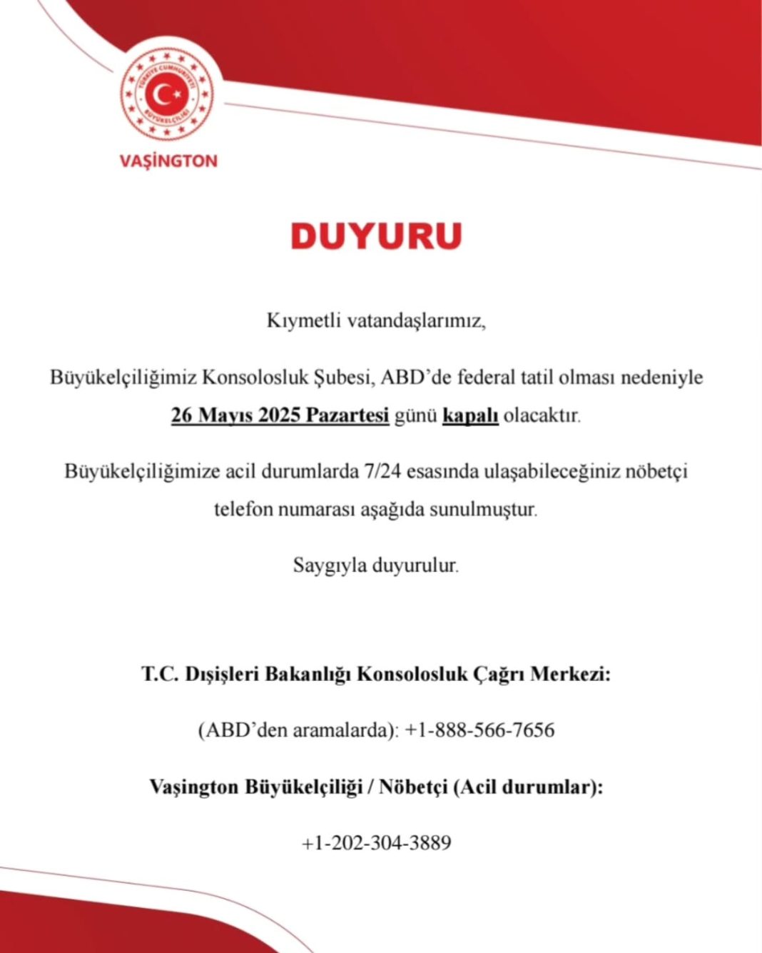 Ana SayfaABD🇺🇸🇹🇷 T.C. Washington Büyükelçiliği’nden ”tatil” Duyurusu📣 ABD 24 Mayıs 2025 🇺🇸🇹🇷 T.C. Washington Büyükelçiliği’nden ”tatil” Duyurusu📣 By Usaturknews Paylaş FacebookTwitterPinterestWhatsApp - Advertisement - - Advertisement - Paylaş FacebookTwitterPinterestWhatsApp Usaturknews - Advertisement - Bizi Sosyal Medyadan Takip Edin 16,985BeğenenlerBeğen2,458TakipçilerTakip Et61,453AboneAbone Ol Okumalısınız! ABD Trump: Ülkemizi aptal insanlar yönetiyordu, bu yüzden 38 trilyon dolar borcumuz var Usaturknews - 5 Aralık 2025 - Advertisement - ABD ABD, göçmenlere verilen çalışma izni süresini 5 yıldan 18 aya düşürdü 5 Aralık 2025 ABD ABD, seyahat yasağı listesini genişletmeye hazırlanıyor: ‘Ülke sayısı 30’un üzerine çıkabilir’ 5 Aralık 2025 ABD 2 popüler cips market raflarından kaldırıldı! Uzmanlardan “Kesinlikle tüketmeyin” uyarısı 5 Aralık 2025 Related News ABD Trump: Ülkemizi aptal insanlar yönetiyordu, bu yüzden 38 trilyon dolar borcumuz var 5 Aralık 2025 ABD ABD, göçmenlere verilen çalışma izni süresini 5 yıldan 18 aya düşürdü 5 Aralık 2025 ABD ABD, seyahat yasağı listesini genişletmeye hazırlanıyor: ‘Ülke sayısı 30’un üzerine çıkabilir’ 5 Aralık 2025 ABD 2 popüler cips market raflarından kaldırıldı! Uzmanlardan “Kesinlikle tüketmeyin” uyarısı 5 Aralık 2025 ABD Trump: Yakında kara yoluyla uyuşturucu kaçakçılığını hedef almaya başlayacağız 4 Aralık 2025 - Advertisement - CEVAP VER İptal Yorum: Lütfen yorumunuzu giriniz! İsim:* Lütfen isminizi buraya giriniz E-Posta:* Yanlış bir e-posta adresi girdiniz! Lütfen e-posta adresinizi buraya girin Website: Ismimi, e-postamı ve web sitemi bir dahaki sefere bu tarayıcıya kaydet.