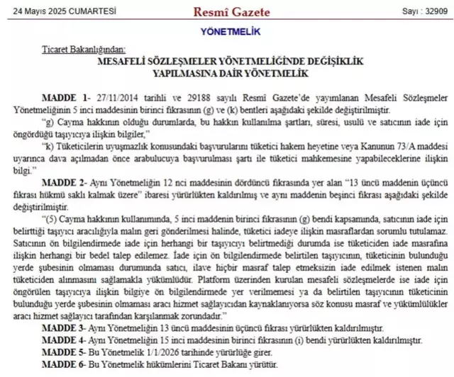 1 Ocak 2026 tarihinde yürürlüğe girecek düzenlemede, tüketicilerin mesafeli alışverişlerde ürün iadesi yaparken kargo ücretinden sorumlu tutulamayacak. Buna göre, cayma hakkını kullanan tüketicilerin iade kargo ücreti, satıcı veya sağlayıcı tarafından karşılanacak.