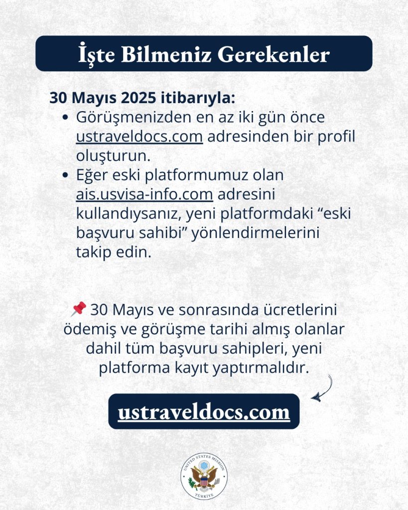 ABD’nin Türkiye Büyükelçiliği, 30 Mayıs 2025’ten itibaren yeni bir vize randevusu oluşturma platformuna geçecektir: ustraveldocs.com