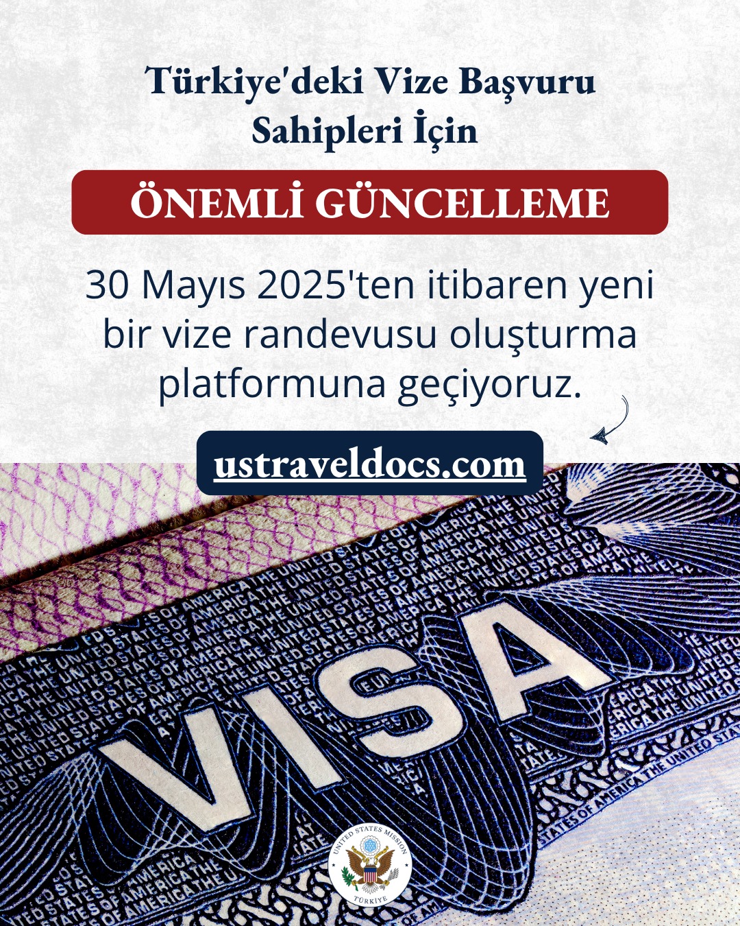 ABD’nin Türkiye Büyükelçiliği, 30 Mayıs 2025’ten itibaren yeni bir vize randevusu oluşturma platformuna geçecektir: ustraveldocs.com