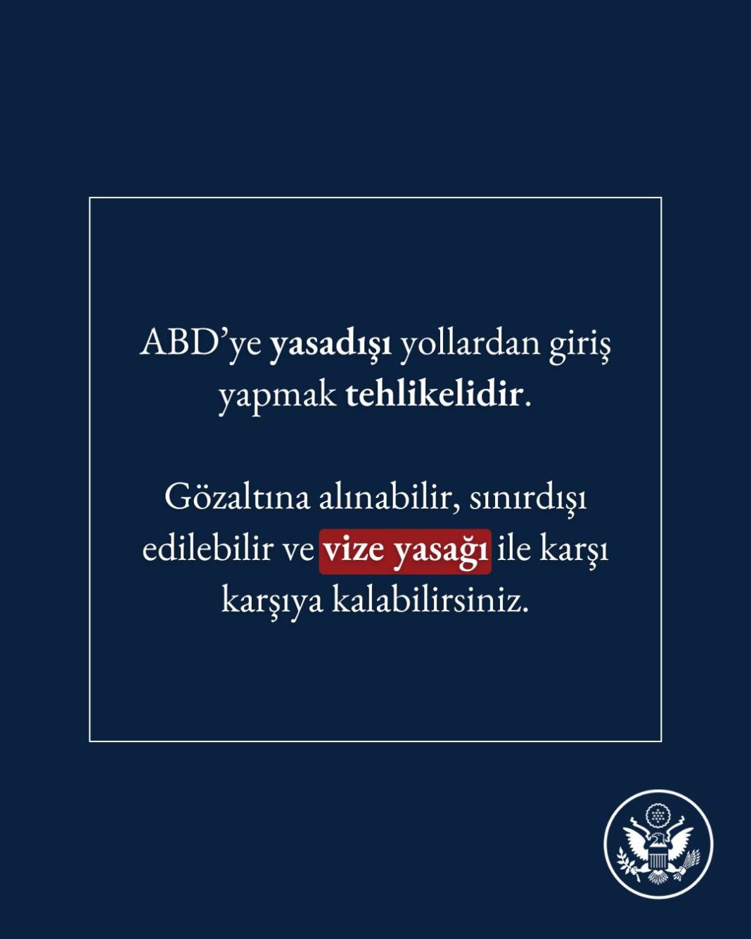 ABD’ye yasadışı yollardan giriş yapmak tehlikelidir. Gözaltına alınabilir, sınırdışı edilebilir ve vize yasağı ile karşı karşıya kalabilirsiniz.