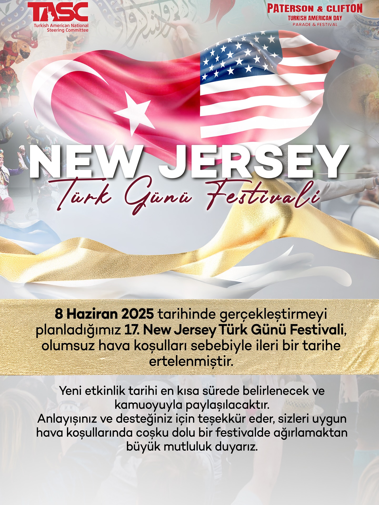 8 Haziran 2025 tarihinde yapılması planlanan 17. New Jersey Türk Günü Festivali, olumsuz hava koşulları nedeniyle ileri bir tarihe ertelendi. Yeni etkinlik tarihi önümüzdeki günlerde duyurulacak.