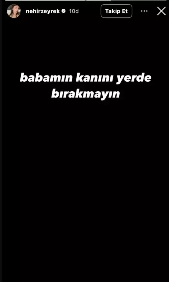 Zeyrek’in ölüm haberinin ardından sosyal medya hesabından paylaşım yapan Zeyrek’in kızı Nehir Zeyrek, dikkat çeken bir paylaşımda bulundu. Nehir Zeyrek paylaşımında “Babamın kanını yerde bırakmayın” ifadelerini kullandı.