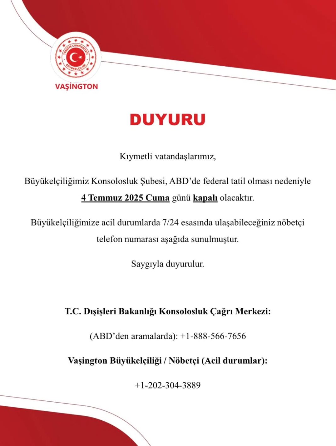 Ana SayfaABD🇺🇸🇹🇷 T.C. Washington Büyükelçiliği’nden ”tatil” Duyurusu📣 ABD 4 Temmuz 2025 🇺🇸🇹🇷 T.C. Washington Büyükelçiliği’nden ”tatil” Duyurusu📣 By Usaturknews Paylaş FacebookTwitterPinterestWhatsApp - Advertisement - - Advertisement - Paylaş FacebookTwitterPinterestWhatsApp Usaturknews - Advertisement - Bizi Sosyal Medyadan Takip Edin 16,985BeğenenlerBeğen2,458TakipçilerTakip Et61,453AboneAbone Ol Okumalısınız! ABD Trump: Ülkemizi aptal insanlar yönetiyordu, bu yüzden 38 trilyon dolar borcumuz var Usaturknews - 5 Aralık 2025 - Advertisement - ABD ABD, göçmenlere verilen çalışma izni süresini 5 yıldan 18 aya düşürdü 5 Aralık 2025 ABD ABD, seyahat yasağı listesini genişletmeye hazırlanıyor: ‘Ülke sayısı 30’un üzerine çıkabilir’ 5 Aralık 2025 ABD 2 popüler cips market raflarından kaldırıldı! Uzmanlardan “Kesinlikle tüketmeyin” uyarısı 5 Aralık 2025 Related News ABD Trump: Ülkemizi aptal insanlar yönetiyordu, bu yüzden 38 trilyon dolar borcumuz var 5 Aralık 2025 ABD ABD, göçmenlere verilen çalışma izni süresini 5 yıldan 18 aya düşürdü 5 Aralık 2025 ABD ABD, seyahat yasağı listesini genişletmeye hazırlanıyor: ‘Ülke sayısı 30’un üzerine çıkabilir’ 5 Aralık 2025 ABD 2 popüler cips market raflarından kaldırıldı! Uzmanlardan “Kesinlikle tüketmeyin” uyarısı 5 Aralık 2025 ABD Trump: Yakında kara yoluyla uyuşturucu kaçakçılığını hedef almaya başlayacağız 4 Aralık 2025 - Advertisement - CEVAP VER İptal Yorum: Lütfen yorumunuzu giriniz! İsim:* Lütfen isminizi buraya giriniz E-Posta:* Yanlış bir e-posta adresi girdiniz! Lütfen e-posta adresinizi buraya girin Website: Ismimi, e-postamı ve web sitemi bir dahaki sefere bu tarayıcıya kaydet.