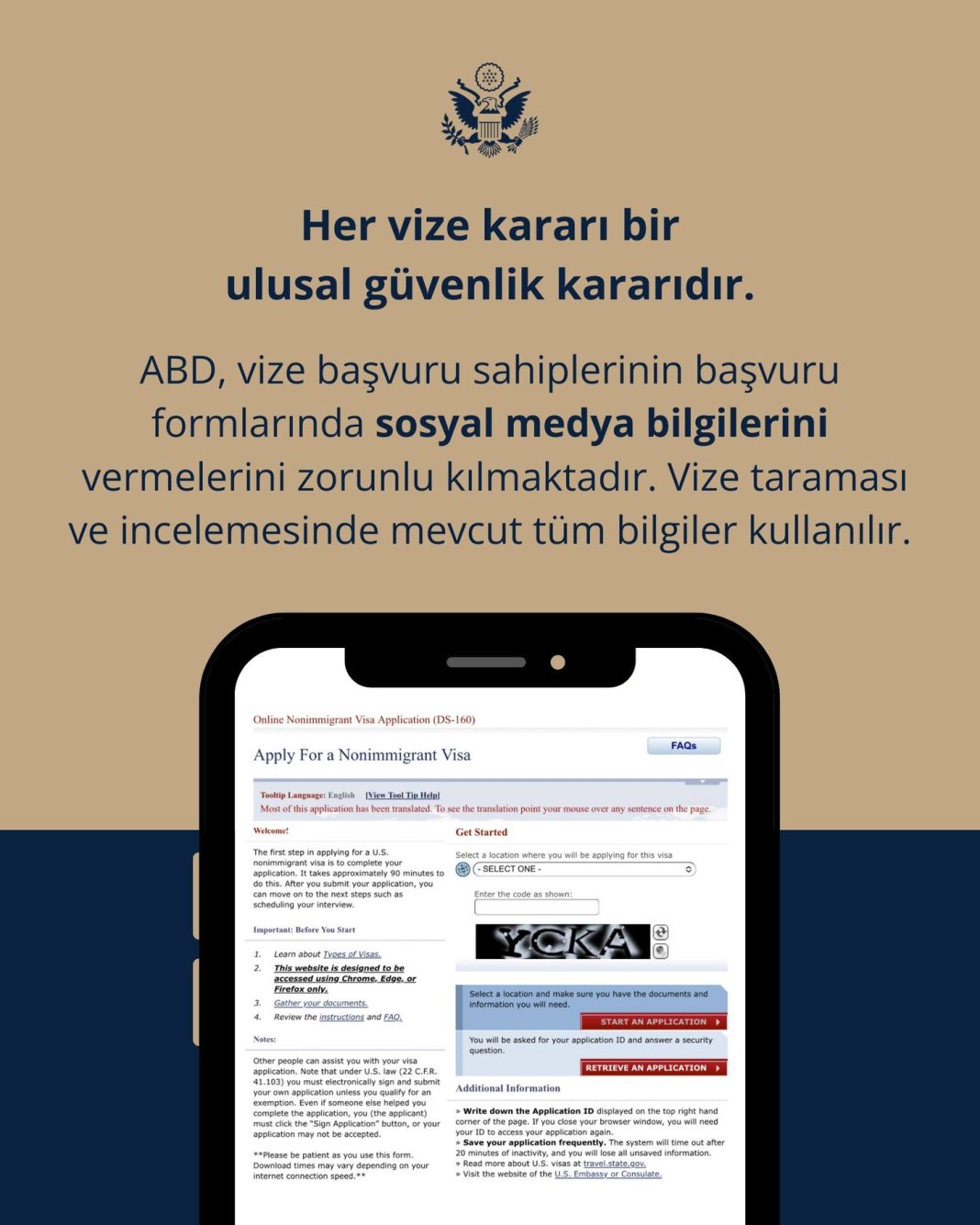 Ulusal güvenliğimize tehdit teşkil eden kişiler de dahil olmak üzere, Amerika Birleşik Devletleri’ne giriş yapmaya uygun olmayan başvuru sahiplerini tespit etmek için vize değerlendirme ve onaylama sürecimizde elimizdeki tüm bilgileri kullanmaktayız. Amerika Birleşik Devletleri, 2019’dan beri göçmen vizesine ve göçmen olmayan vize türlerine başvuran kişilerin sosyal medya bilgilerini sunmalarını gerektirmektedir.
