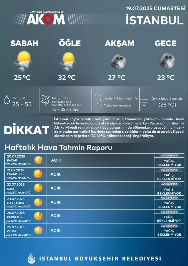 AKOM’un yayınladığı tahminlere göre, İstanbul’da 22 Temmuz Salı, 23 Temmuz Çarşamba, 24 Temmuz Perşembe ve 25 Temmuz Cuma günü hava sıcaklığının 40 derece olacağı ön görülüyor.