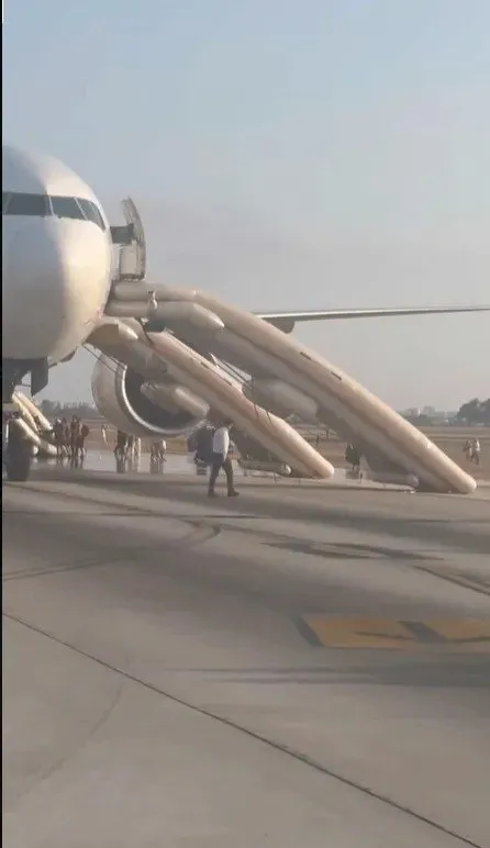 Uçak, Antalya Havalimanı’na iner inmez yolcularını acil tahliye etti. Yolcuların, acil tahliye kaydırağından uçağı terk ettiği görüldü.