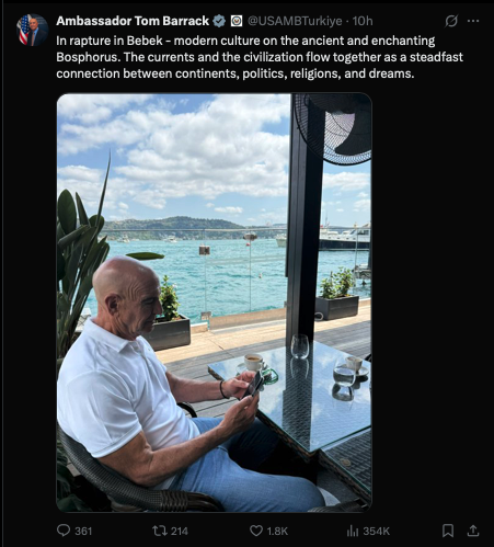 ABD’nin Ankara Büyükelçisi ve Suriye Özel Temsilcisi Tom Barrack dikkat çeken bir paylaşım yaptı. Barrack, Bebek’te boğaz manzarasına karşı kahve içtiği anı paylaştı.