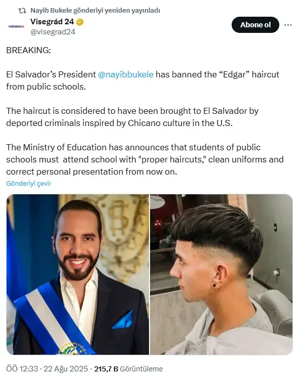 El Salvador Devlet Başkanı Nayib Bukele yönetimi devlet okullarında “Edgar” adı verilen saç kesimini yasaklandı.