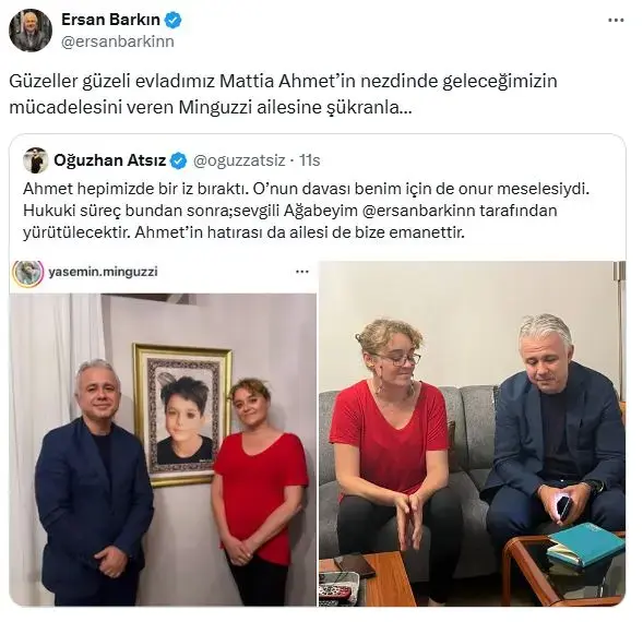 Ersan Barkın, sosyal medya hesabından yaptığı paylaşımda, Minguzzi’nin annesi Yasemin Minguzzi ile çektirdiği bir fotoğrafı alıntılayarak “Güzeller güzeli evladımız Mattia Ahmet’in nezdinde geleceğimizin mücadelesini veren Minguzzi ailesine şükranla…” notunu düştü.