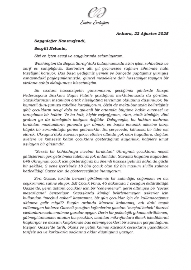 Emine Erdoğan’dan Melania Trump’a Mektup: Zulme Uğrayan Çocuklar İçin Ortak Vicdan Çağrısı