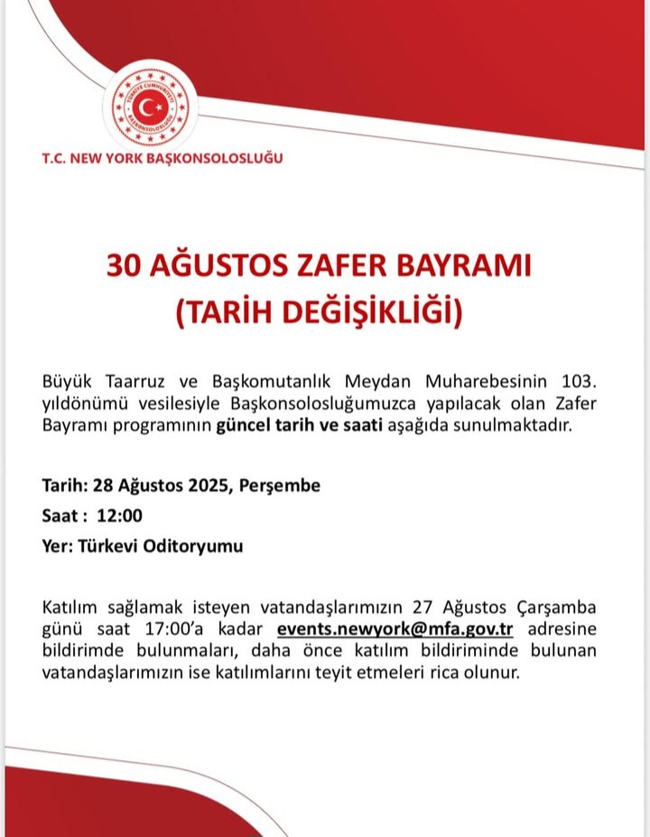 Ana SayfaABD🇺🇸🇹🇷T.C. New York Başkonsolosluğu’ndan Duyuru 📣 ABD 27 Ağustos 2025 🇺🇸🇹🇷T.C. New York Başkonsolosluğu’ndan Duyuru 📣 By Usaturknews Paylaş FacebookTwitterPinterestWhatsApp - Advertisement - - Advertisement - Paylaş FacebookTwitterPinterestWhatsApp Usaturknews - Advertisement - Bizi Sosyal Medyadan Takip Edin 16,985BeğenenlerBeğen2,458TakipçilerTakip Et61,453AboneAbone Ol Okumalısınız! ABD Trump: Ülkemizi aptal insanlar yönetiyordu, bu yüzden 38 trilyon dolar borcumuz var Usaturknews - 5 Aralık 2025 - Advertisement - ABD ABD, göçmenlere verilen çalışma izni süresini 5 yıldan 18 aya düşürdü 5 Aralık 2025 ABD ABD, seyahat yasağı listesini genişletmeye hazırlanıyor: ‘Ülke sayısı 30’un üzerine çıkabilir’ 5 Aralık 2025 ABD 2 popüler cips market raflarından kaldırıldı! Uzmanlardan “Kesinlikle tüketmeyin” uyarısı 5 Aralık 2025 Related News ABD Trump: Ülkemizi aptal insanlar yönetiyordu, bu yüzden 38 trilyon dolar borcumuz var 5 Aralık 2025 ABD ABD, göçmenlere verilen çalışma izni süresini 5 yıldan 18 aya düşürdü 5 Aralık 2025 ABD ABD, seyahat yasağı listesini genişletmeye hazırlanıyor: ‘Ülke sayısı 30’un üzerine çıkabilir’ 5 Aralık 2025 ABD 2 popüler cips market raflarından kaldırıldı! Uzmanlardan “Kesinlikle tüketmeyin” uyarısı 5 Aralık 2025 ABD Trump: Yakında kara yoluyla uyuşturucu kaçakçılığını hedef almaya başlayacağız 4 Aralık 2025 - Advertisement - CEVAP VER İptal Yorum: Lütfen yorumunuzu giriniz! İsim:* Lütfen isminizi buraya giriniz E-Posta:* Yanlış bir e-posta adresi girdiniz! Lütfen e-posta adresinizi buraya girin Website: Ismimi, e-postamı ve web sitemi bir dahaki sefere bu tarayıcıya kaydet.