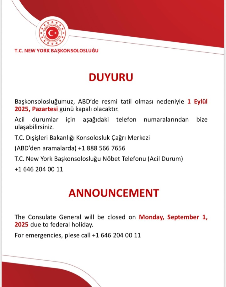 Ana SayfaABD🇺🇸🇹🇷T.C. New York Başkonsolosluğu’ndan Duyuru 📣 ABD 30 Ağustos 2025 🇺🇸🇹🇷T.C. New York Başkonsolosluğu’ndan Duyuru 📣 By Usaturknews Paylaş FacebookTwitterPinterestWhatsApp - Advertisement - - Advertisement - Paylaş FacebookTwitterPinterestWhatsApp Usaturknews - Advertisement - Bizi Sosyal Medyadan Takip Edin 16,985BeğenenlerBeğen2,458TakipçilerTakip Et61,453AboneAbone Ol Okumalısınız! ABD Trump: Ülkemizi aptal insanlar yönetiyordu, bu yüzden 38 trilyon dolar borcumuz var Usaturknews - 5 Aralık 2025 - Advertisement - ABD ABD, göçmenlere verilen çalışma izni süresini 5 yıldan 18 aya düşürdü 5 Aralık 2025 ABD ABD, seyahat yasağı listesini genişletmeye hazırlanıyor: ‘Ülke sayısı 30’un üzerine çıkabilir’ 5 Aralık 2025 ABD 2 popüler cips market raflarından kaldırıldı! Uzmanlardan “Kesinlikle tüketmeyin” uyarısı 5 Aralık 2025 Related News ABD Trump: Ülkemizi aptal insanlar yönetiyordu, bu yüzden 38 trilyon dolar borcumuz var 5 Aralık 2025 ABD ABD, göçmenlere verilen çalışma izni süresini 5 yıldan 18 aya düşürdü 5 Aralık 2025 ABD ABD, seyahat yasağı listesini genişletmeye hazırlanıyor: ‘Ülke sayısı 30’un üzerine çıkabilir’ 5 Aralık 2025 ABD 2 popüler cips market raflarından kaldırıldı! Uzmanlardan “Kesinlikle tüketmeyin” uyarısı 5 Aralık 2025 ABD Trump: Yakında kara yoluyla uyuşturucu kaçakçılığını hedef almaya başlayacağız 4 Aralık 2025 - Advertisement - CEVAP VER İptal Yorum: Lütfen yorumunuzu giriniz! İsim:* Lütfen isminizi buraya giriniz E-Posta:* Yanlış bir e-posta adresi girdiniz! Lütfen e-posta adresinizi buraya girin Website: Ismimi, e-postamı ve web sitemi bir dahaki sefere bu tarayıcıya kaydet.