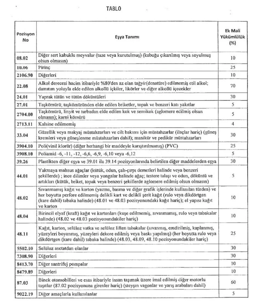 Ek vergi getirilen ürünler arasında alkollü içecekler, otomobil, makyaj malzemeleri ve yaprak tütünleri de vardı.