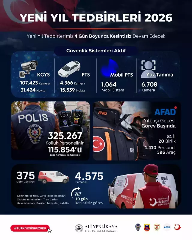 İçişleri Bakanı Ali Yerlikaya, yılbaşında 12 bin 687 uygulama noktası oluşturulduğunu, 298 bini asayiş, 27 bini trafik alanında 325 bin 267 personelin görevlendirildiğini açıkladı. Bakan Yerlikaya bu tedbirlerin 30 Aralık 2025 – 2 Ocak 2026 tarihleri arasında 4 gün boyunca kesintisiz şekilde uygulanacağını ifade etti.