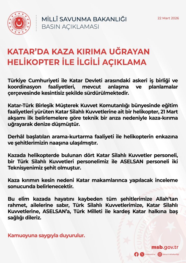 Milli Savunma Bakanlığı ise kazayla ilgili açıklamasında kahreden detayları paylaştı. Helikopterin teknik arıza nedeniyle kaza-kırıma uğrayarak denize düştüğü ifade edilirken, kazada 1 askerimiz ve 2 ASELSAN teknisyeninin şehit olduğu belirtildi. Kazada ölenlerden 4’ünün ise Katar askeri olduğu öğrenildi.