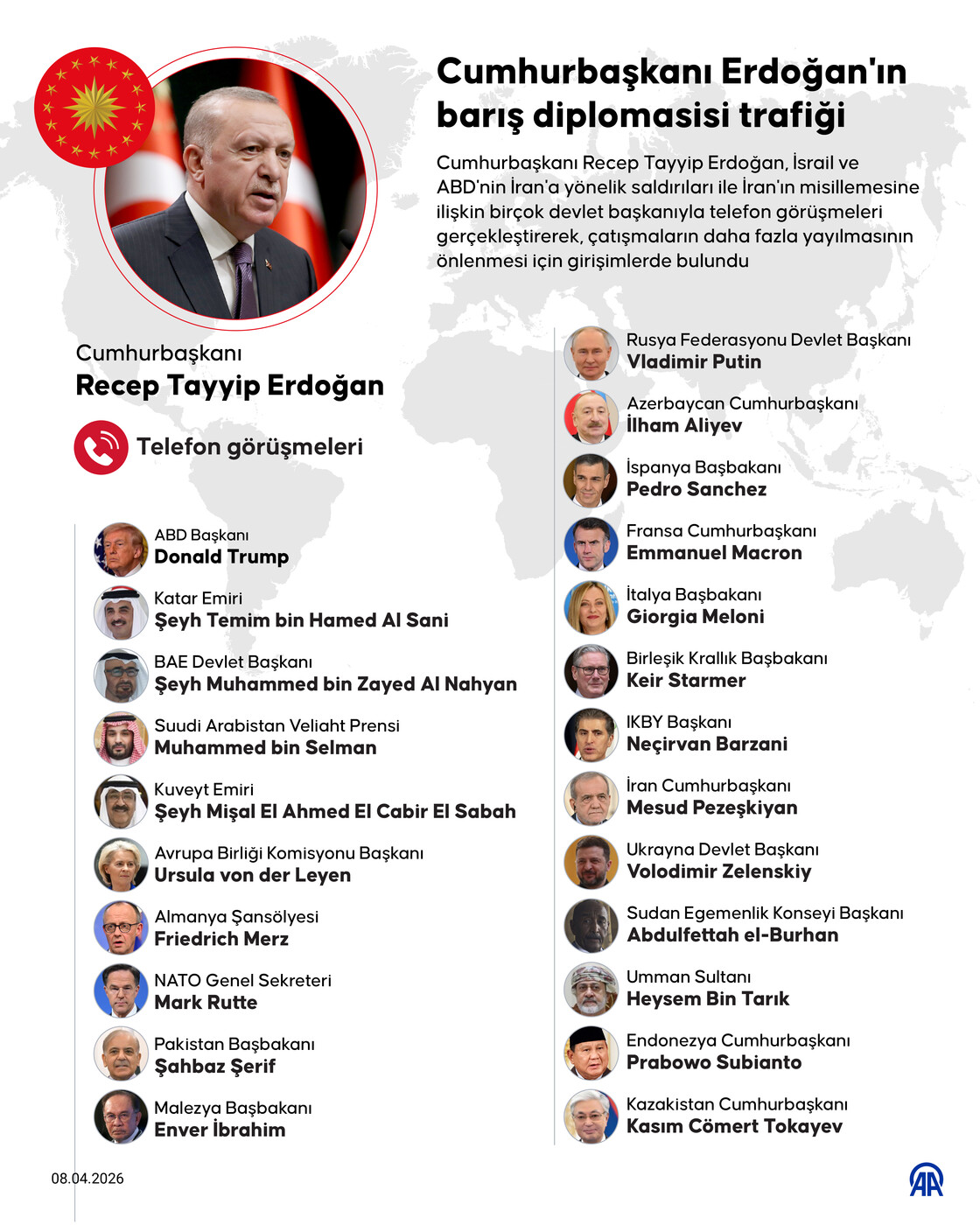 Cumhurbaşkanı Recep Tayyip Erdoğan, İsrail ve ABD’nin İran’a yönelik saldırıları ile İran’ın misillemesine ilişkin birçok devlet başkanıyla telefon görüşmeleri gerçekleştirerek, çatışmaların daha fazla yayılmasının önlenmesi için girişimlerde bulundu.