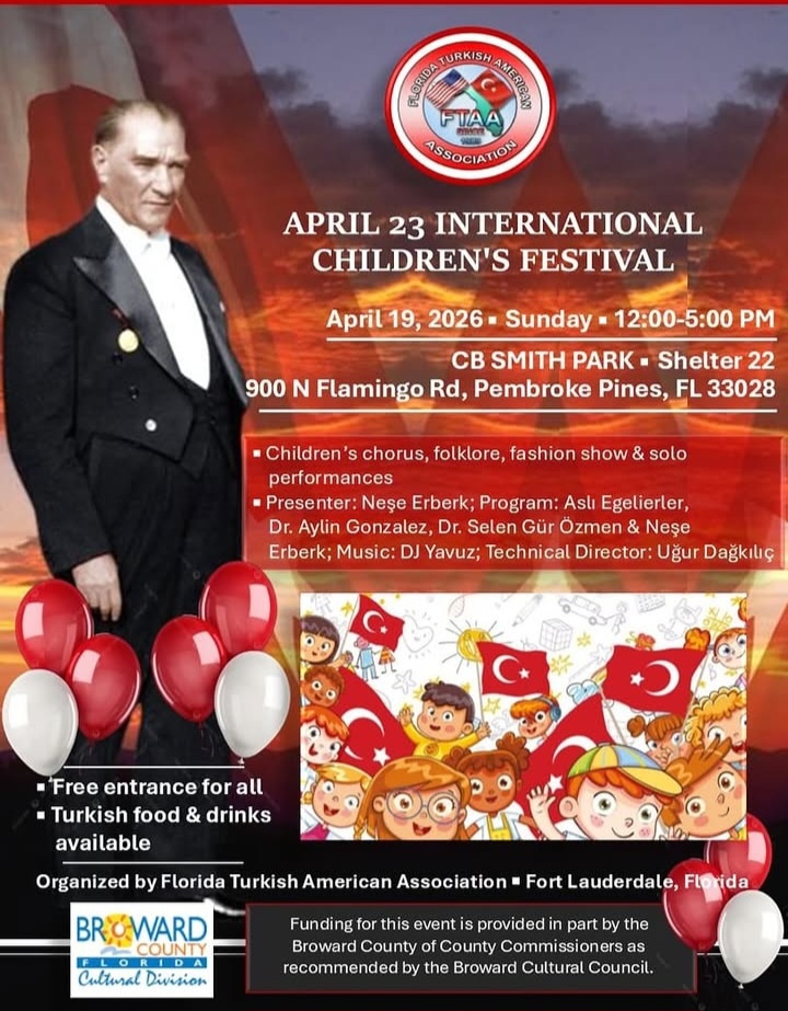 Florida Türk Amerikan Derneği (FTAA) tarafından 19 Nisan 2026 Pazar günü CB Smith Park’ta 23 Nisan Çocuk Şenliği düzenlenecektir. Etkinliğe girişler ücretsizdir.